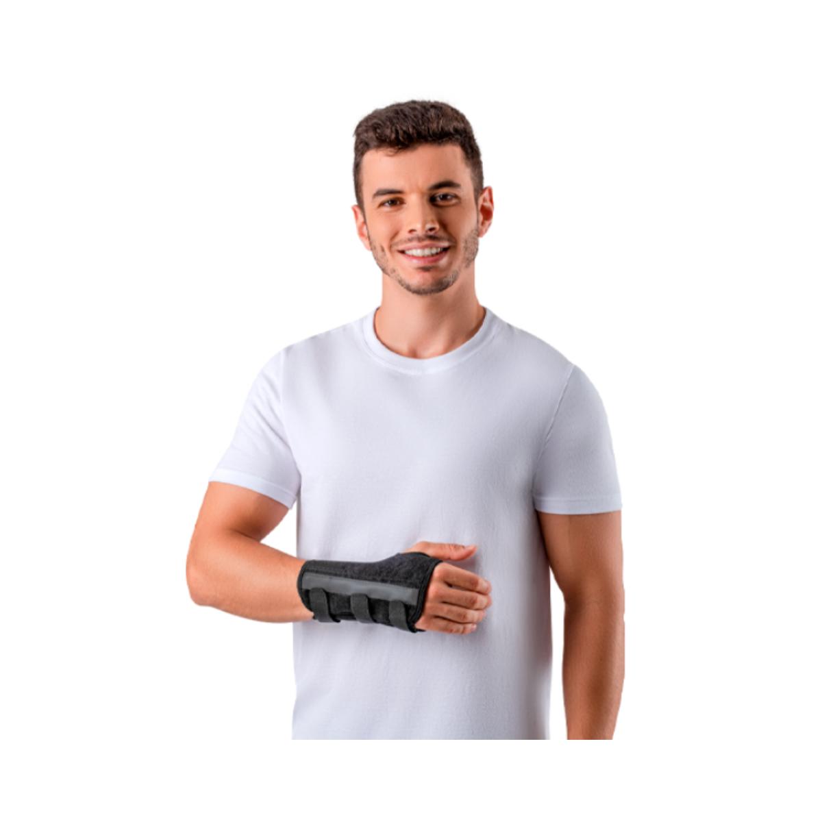 Aplicar conforme indicação. Solte as tiras aderentes. Vista o produto. Insira o polegar no orifício encaixando a curvatura da tala na palma da mão. Ajuste a compressão de acordo com a necessidade através das 3 tiras aderentes.