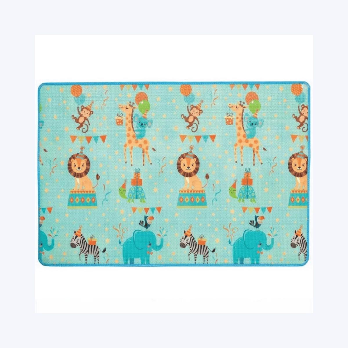 Design Dupla Face: De um lado, uma estampa vibrante com o tema "Animal Party" para entreter; do outro, ilustrações educativas que auxiliam no reconhecimento de animais e formas.